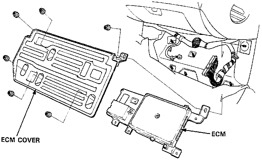 If the inspection for a particular code requires the Test Harness, remove the right door sill molding and the small cover on the right kick panel and pull the carpet back to expose the ECM. Unbolt the ECM cover. Turn the Ignition Switch off and connect the Test Harness.