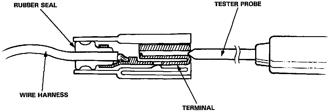 - For testing at connectors other than the Test Harness, bring the Tester Probe into contact with the terminal from the connector side of Wire Harness Connectors in the Engine Compartment. For female connectors, just touch lightly with the Tester Probe and do not insert the probe.