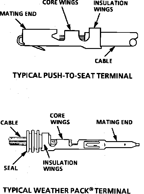 The following repair procedures can be used to repair Push-to-Seat, Pull-to-Seat or Weather Pack(R) terminals, Fig. 22. Some terminals do not require all steps shown. Skip those that don't apply. (Refer to Kent-Moore Terminal Repair Kit J 38125-A for further information.)