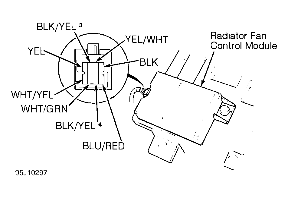 Turn off A/C. Leave radiator fan control module connector attached. See ELECTRICAL COMPONENT LOCATIONS under DESCRIPTION. See Figure. Turn ignition on. Measure voltage at all of the following terminals (except Blue/Red wire) of radiator fan control module connector (backprobe each terminal).