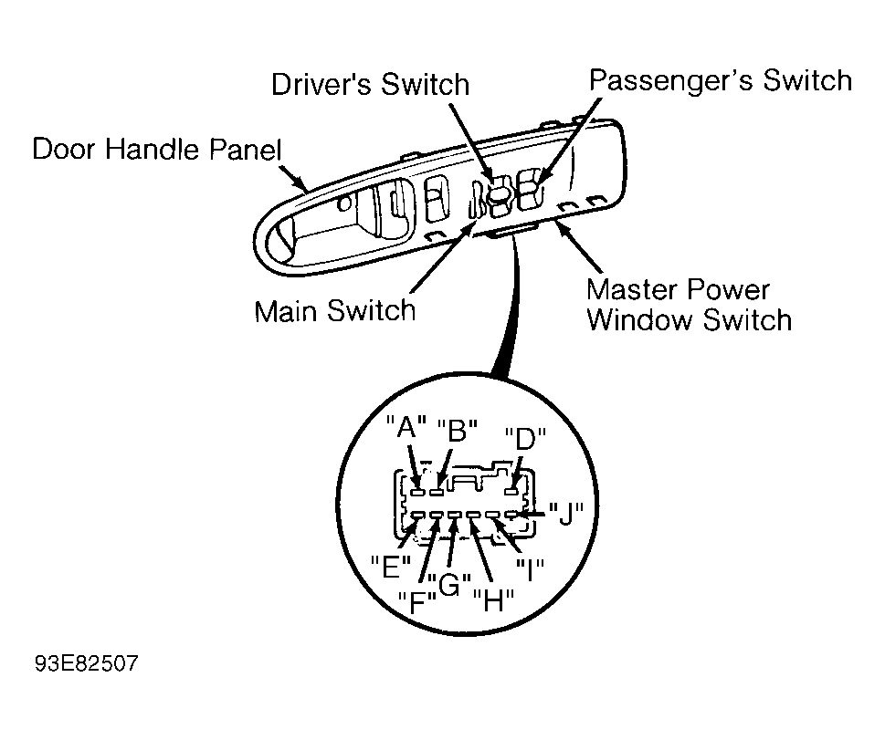 Remove power window master switch. See MASTER POWER WINDOW SWITCH under REMOVAL & INSTALLATION. Using an ohmmeter, check resistance of switch terminals with switch in indicated positions. If continuity is not as specified, replace switch. See Fig 1 . See appropriate POWER WINDOW SWITCH CONTINUITY TEST table.