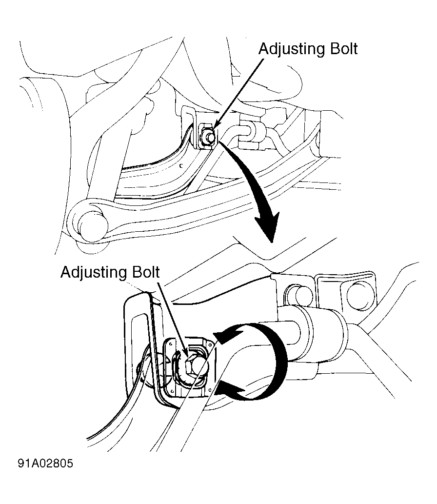 1. Check caster and camber. See WHEEL ALIGNMENT SPECIFICATIONS  table. Adjust if necessary. Secure steering wheel in straight-ahead position. Ensure parking brake is released. Check rear wheel toe-in. If rear toe-in needs adjustment, hold adjusting bolt on rear lower control arm and loosen lock nut. Adjust rear toe-in by turning adjusting bolt until toe-in is correct. Install NEW lock nut, and tighten it while holding adjusting bolt. See Fig 1 . See TORQUE SPECIFICATIONS  .