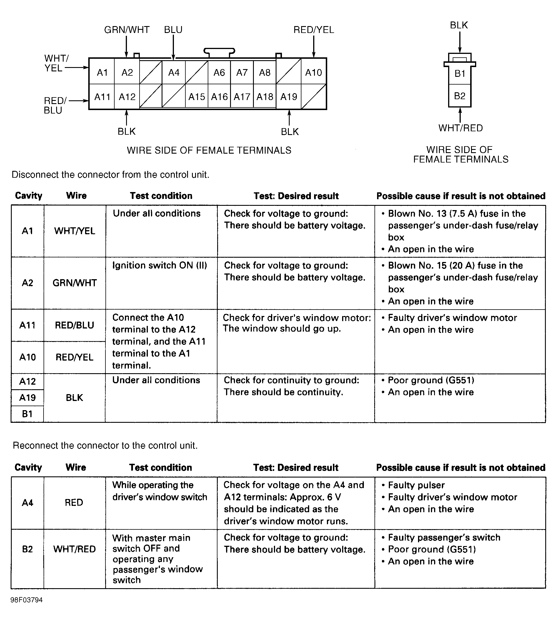 Remove driver's door trim panel. Disconnect 20-pin harness connector. Inspect connector terminals for damage or corrosion. Repair or replace as necessary. Using a DVOM, perform driver's control unit input test. See Fig 1