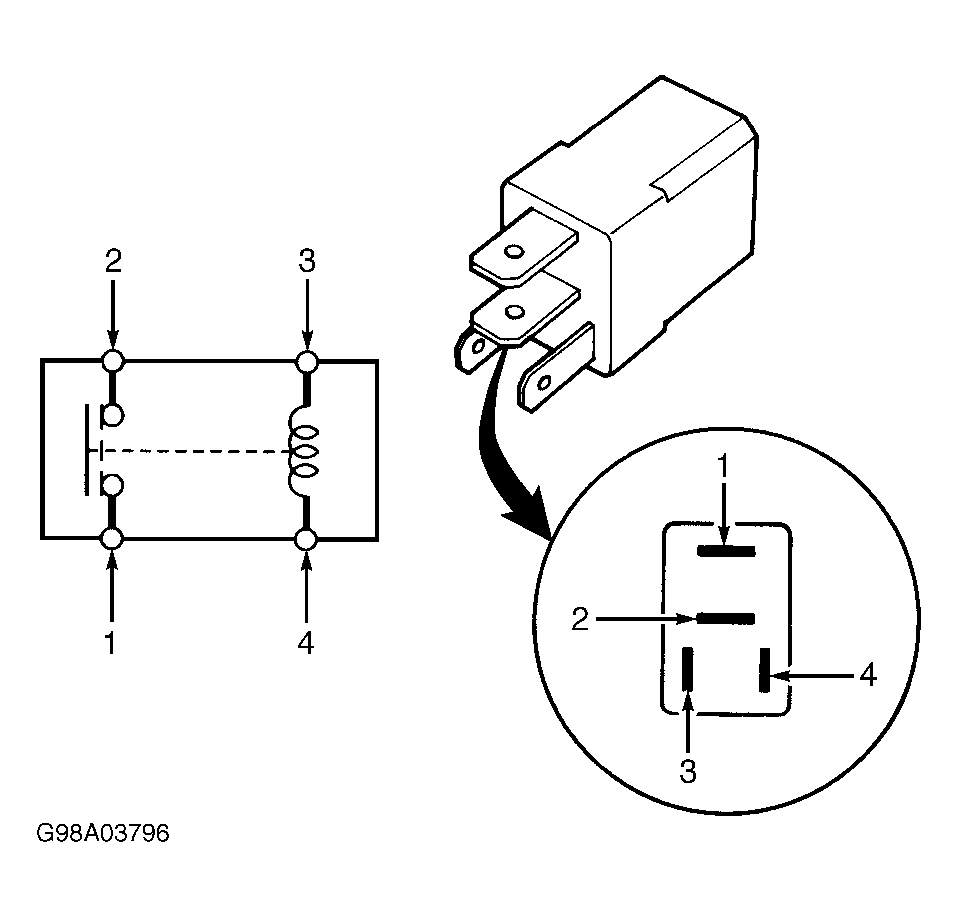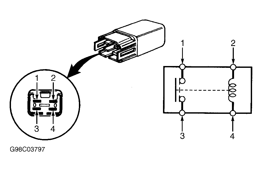 Remove power window relay from underhood fuse/relay block. Using DVOM, check for continuity between relay terminals No. 1 and 2. See Fig 1 -Fig 2 . Continuity should not exist. Using jumper wires, connect terminals No. 3 and 4 to battery voltage and ground. Continuity should now exist between terminals No. 1 and 2. If continuity is not as specified, replace relay.