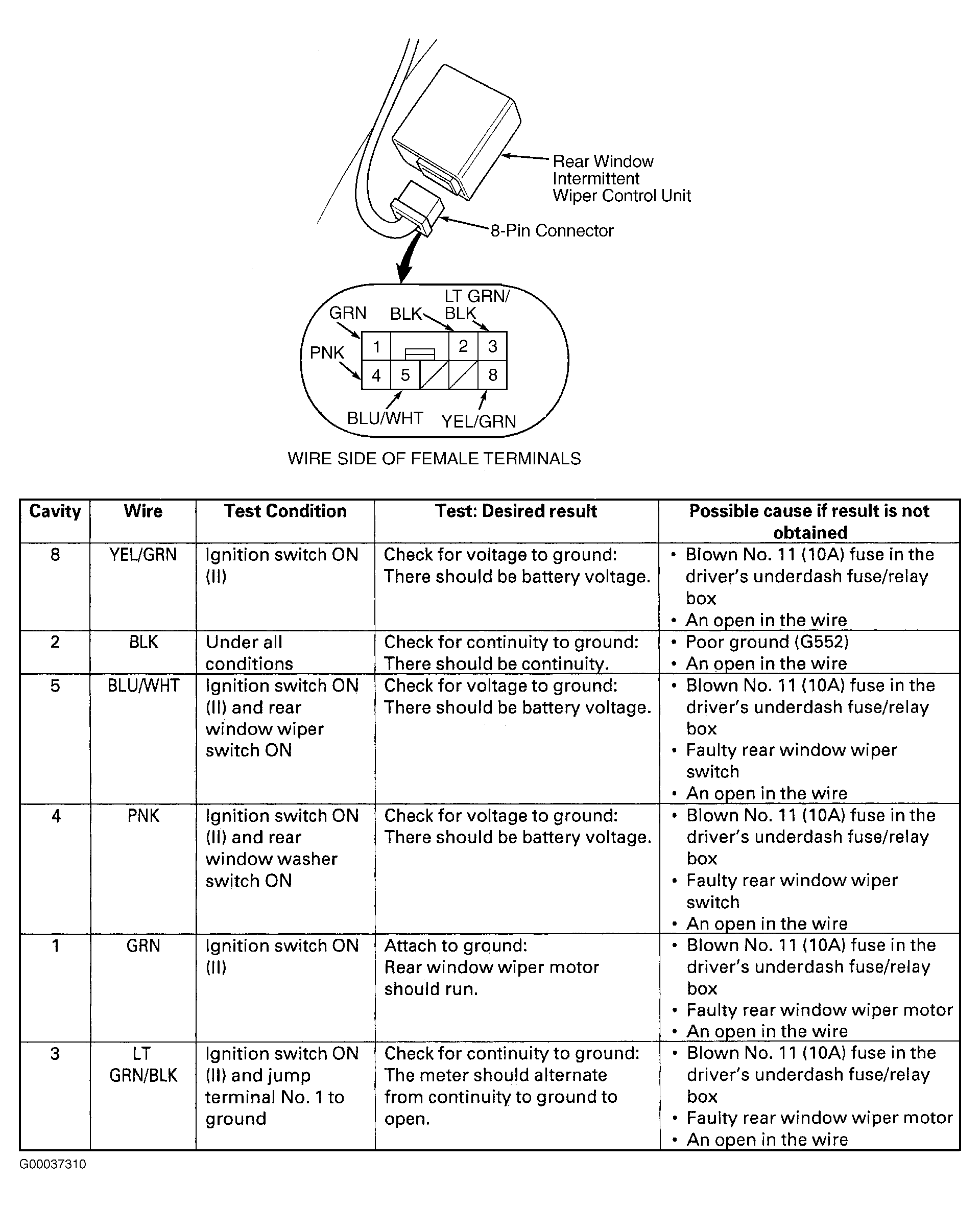 Home >> Honda >> 2000 >> Odyssey EX >> Repair and Diagnosis >> External Pages >> Different car >> Section 11 (Wiper/Washer Systems) >> System Tests >> Rear Window Intermittent Wiper Control Unit Input Test