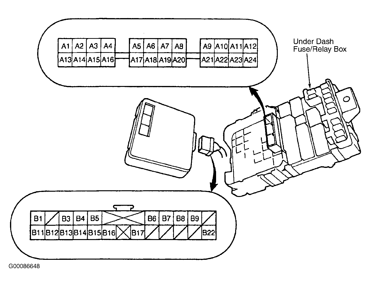 - Disconnect the "B" connector (22-pin) from the multiplex control unit (driver's), then remove the multiplex control unit (driver's) from the driver's under-dash fuse/relay box. See Fig 1 .