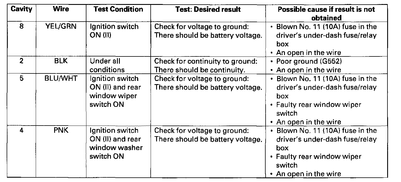 Home >> Honda >> 2001 >> Odyssey EX V6-3.5L >> Repair and Diagnosis >> Wiper and Washer Systems >> Windshield Washer Control Module >> Testing and Inspection >> Rear Window Wiper Intermittent Control Unit Input Test