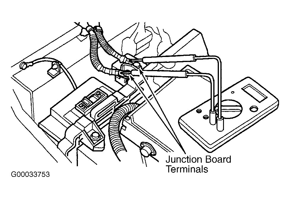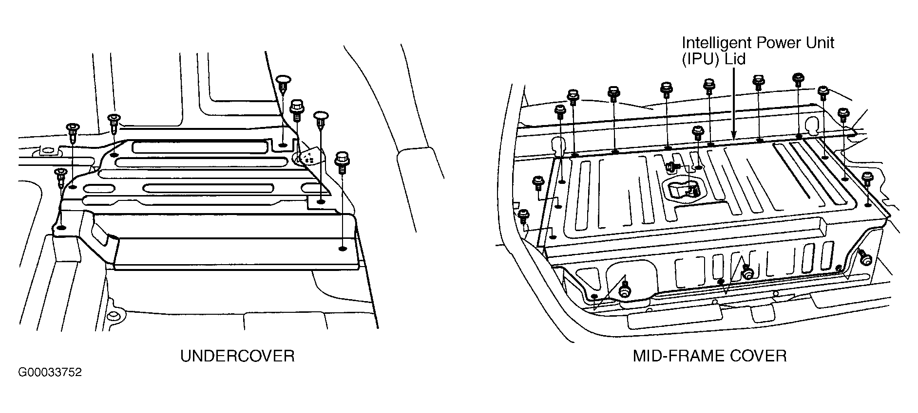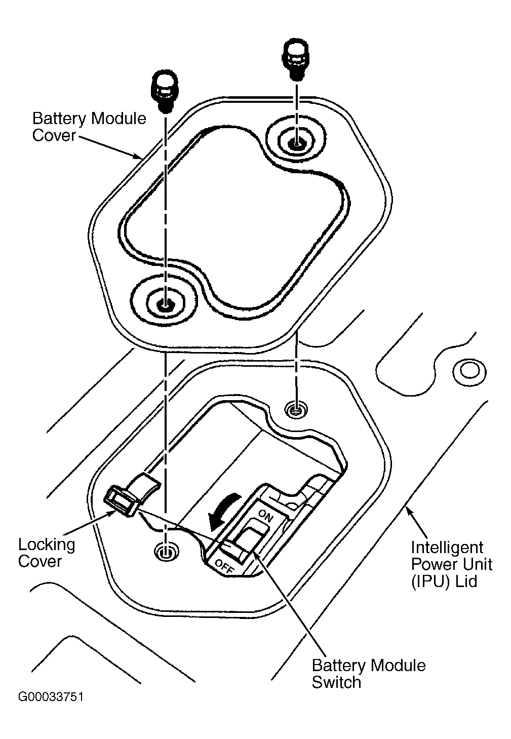 - If necessary to inspect or service high-voltage system, ensure ignition is off. Remove trunk floor mat. Remove battery module cover from Intelligent Power Unit (IPU) lid. Remove locking cover from battery module switch. Turn battery module switch off and install locking cover on switch. See Fig 1. Wait at least 5 minutes to allow condensors to discharge before touching any high-voltage wiring harness, connectors or components. Remove undercover, mid-frame cover clips and IPU lid. See Fig 2. Using a DVOM, measure voltage at junction board terminals. See Fig 3. If voltage reading is 0.1 volt or less, high-voltage system has been properly deactivated and high-voltage cables can be disconnected safely. If voltage is present, DO NOT attempt to disconnect high-voltage cables due to a malfunction in high-voltage system.