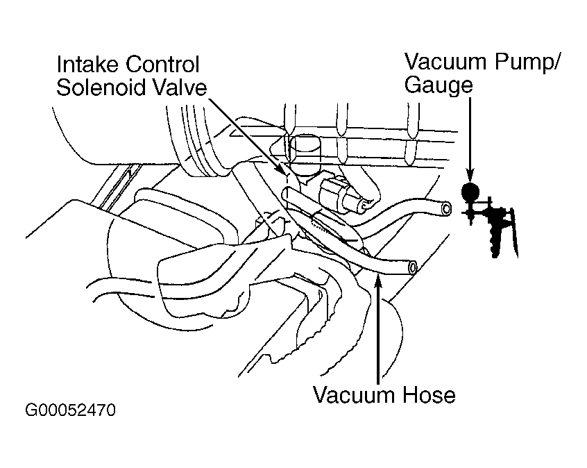 - Start engine and allow to idle. Disconnect vacuum hose from upper port of intake control solenoid valve located at right side of engine, under intake duct. Connect vacuum pump/gauge to intake control solenoid valve. See Fig 1. Check for vacuum at intake control solenoid valve. If vacuum does not exist, go to next step. If vacuum exists, go to step 6.
