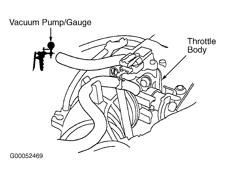 - Start engine and run at 3000 RPM under no load with transaxle in Park or Neutral, until radiator fan comes on. Allow engine to idle. Disconnect vacuum hose that connects to EVAP canister from top of throttle body. Connect vacuum pump/gauge to throttle body. See Fig 1. With engine idling, vacuum should not be indicated at vacuum gauge. If vacuum is not present, go to next step. If vacuum is present, check throttle cable adjustment. See FUEL SYSTEM in ON-VEHICLE ADJUSTMENTS article.