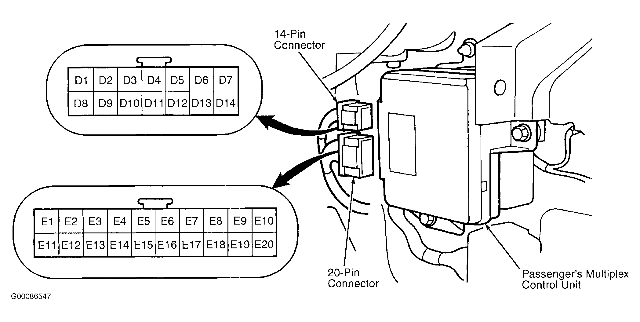 - Check for loose passenger's multiplex control unit harness connectors. Repair as necessary. If connectors are okay, substitute a known-good passenger's multiplex control unit and retest.