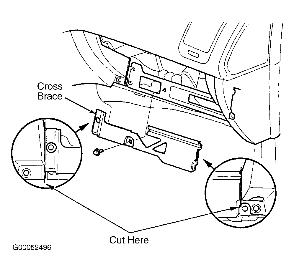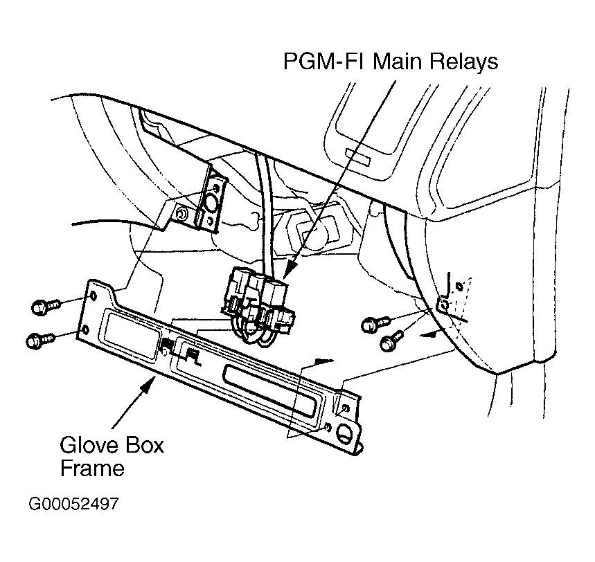 - Remove passenger kick panel. While holding glove box, remove glove box stop from each side. Remove glove box mounting bolts. Remove glove box. Remove bolt from plastic cross brace. Using diagonal cutters, cut glove box opening plastic cross brace as shown in illustration. See Fig 1. Remove PGM-FI main relays. Remove bolts from glove box frame. Remove glove box frame. See Fig 2. Remove Gray wire harness connector from PCM mounting bracket. Remove PCM bracket mounting bolt and bracket. Remove PCM mounting nuts. Remove PCM. See Fig 3.