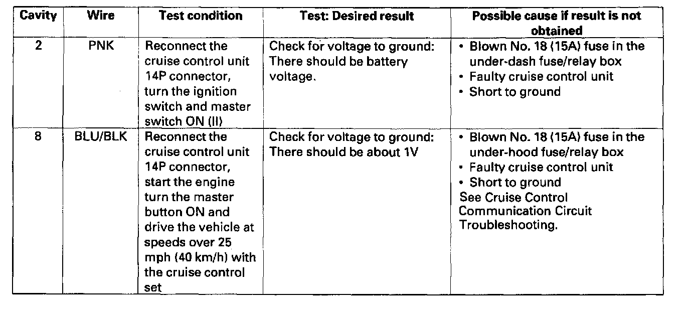 - If all the input tests prove OK, the cruise control unit may by faulty. Substitute a know-good cruise control unit and retest. If the system works properly, replace the cruise control unit.