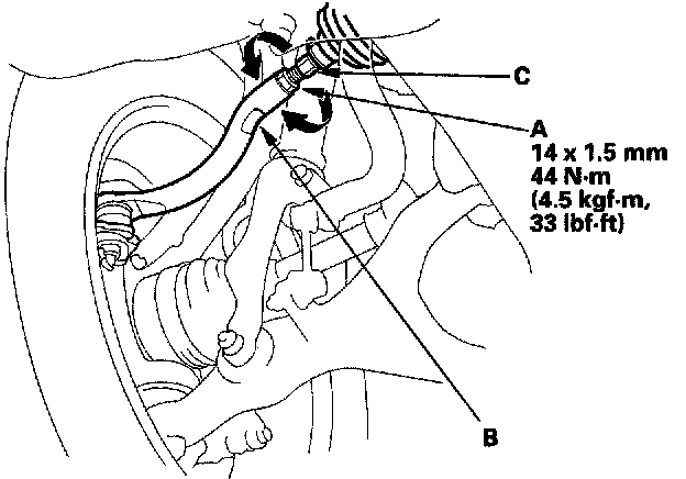 3. Loosen the tie-rod locknuts (A) while holding the flat surface sections (B) of the tie-rod end with a wrench, and turn both rack ends (C) until the front toe is within specifications.