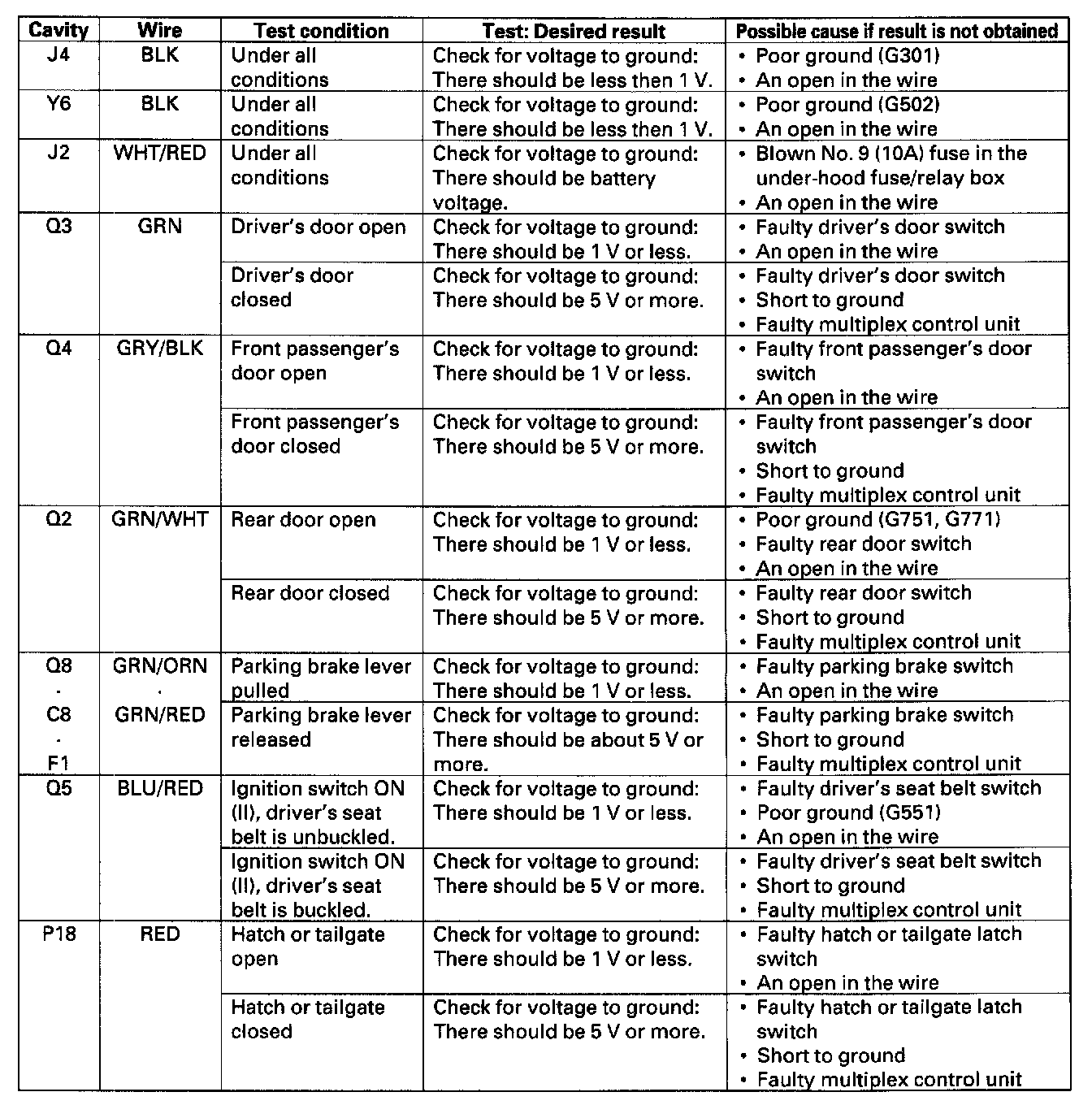 Home >> Honda >> 2003 >> Element 2WD L4-2.4L >> Repair and Diagnosis >> Body and Frame >> Body Control Systems >> Testing and Inspection >> Multiplex Control Unit Input Test