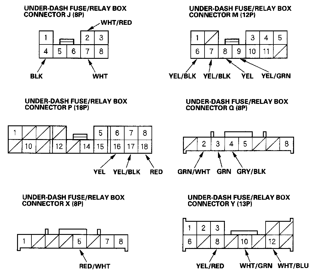 2. Disconnect the under-dash fuse/relay box connectors J, M, P, Q, X and Y.