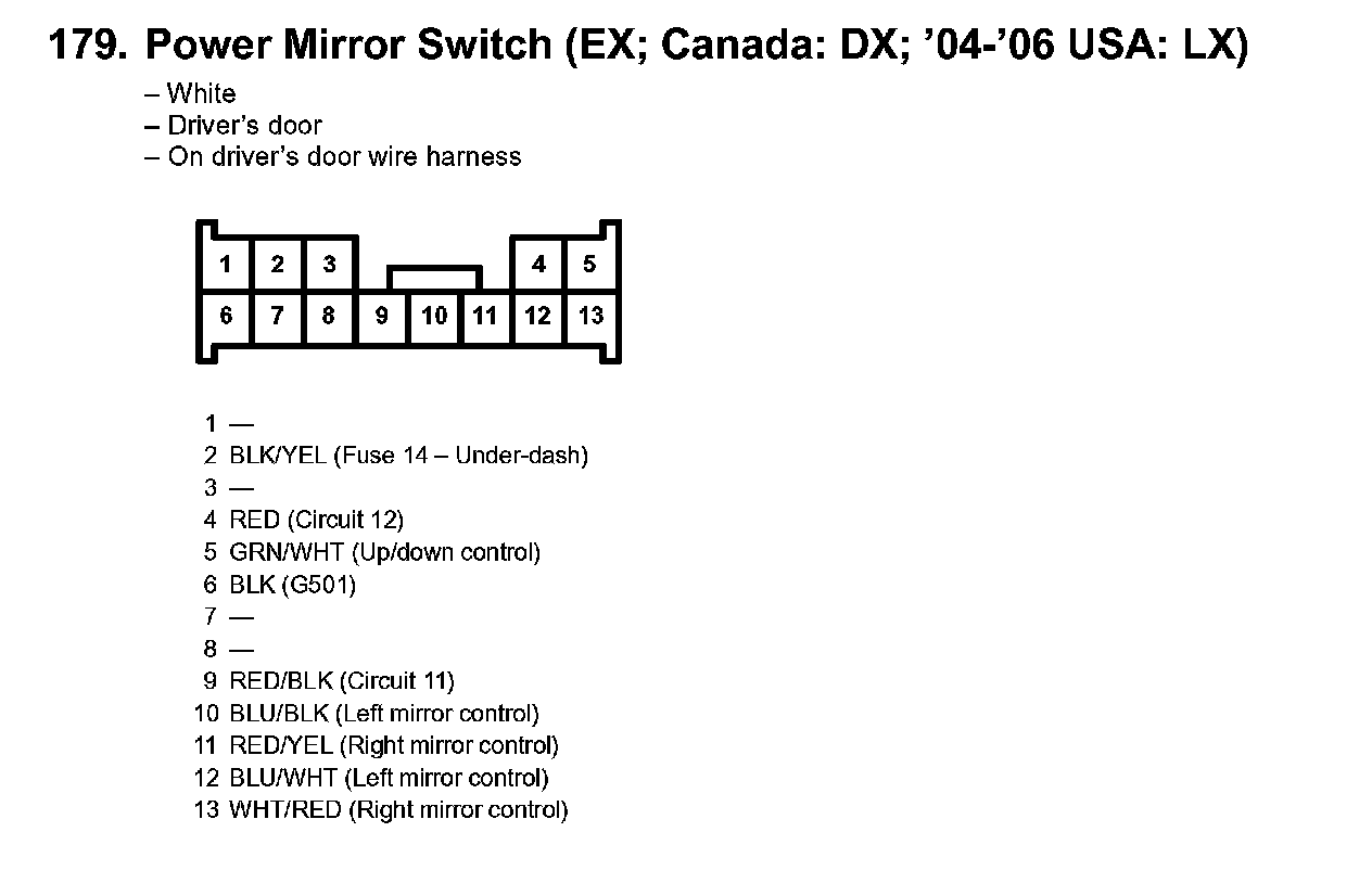 179. Power Mirror Switch (EX; Canada: DX; '04-'06 USA: LX):