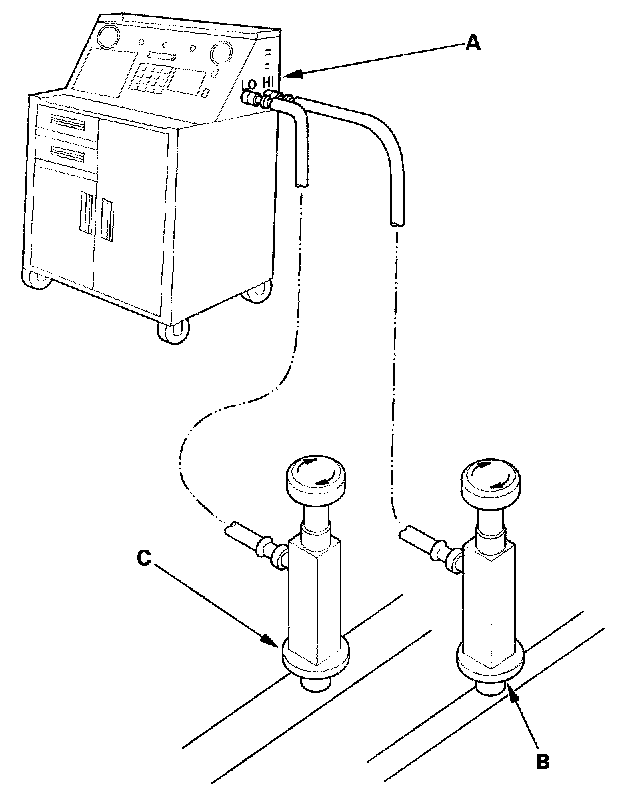 2. Connect a R-134a refrigerant recovery/recycling/charging station (A) to the high-pressure service port (B) and the low-pressure service port (C), as shown, following the equipment manufacturer's instructions. Evacuate the system.