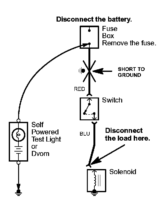 5. If the self-powered test light goes on or the DVOM displays a low reading or no reading (zero), there is a short to ground in the wiring near that point.