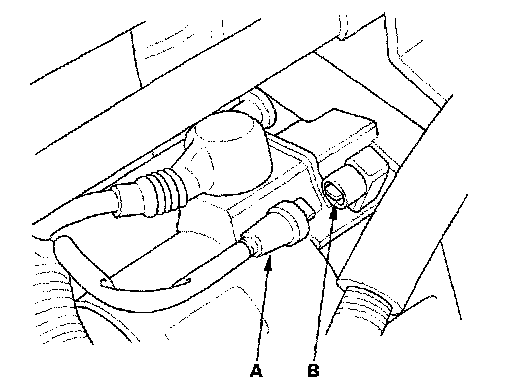 6. Make sure the transmission is in neutral, then disconnect the BLK/WHT wire (A) from the starter solenoid (B). Connect a jumper wire from the battery positive terminal to the solenoid terminal.