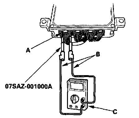 3. If you cannot get to the wire side of the connector or the wire side is sealed (A), disconnect the connector and touch the tester probe (B) to terminals (C) from the terminal side. Do not force the probe into the connector.