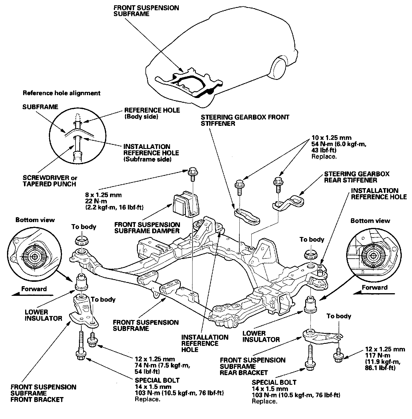 After removing the subframe mounting bolts and steering gearbox stiffener mounting bolts, be sure to replace them with new ones.