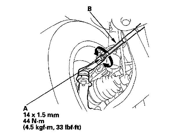 4. Loosen the tie-rod locknuts (A), and turn both tie rods (B) in the same direction until the front wheels are pointing straight ahead.