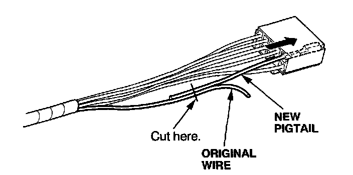 6. Lay the pigtail and the original wire side-by-side, and cut off both ends at once. If you are making more than one splice, do not cut each pigtail at the same location; the resulting "lump" of splice connectors would interfere with rewrapping the harness. Instead, cut the first pigtail close enough to the terminal so you will have room to make each remaining cut about 20 mm (3/4 inch) farther down on the next pigtail.