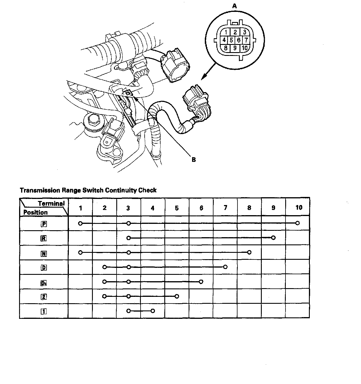 Transmission Range Switch Test1. Remove the transmission range switch connector (A) from the connector bracket (B), then disconnect the connector.