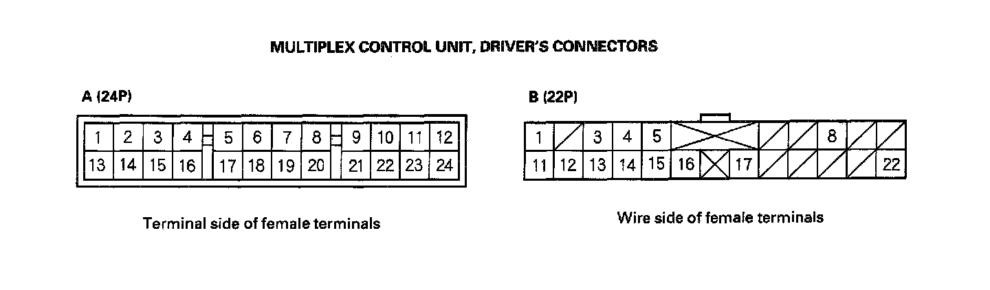 1. Disconnect the 22P connector from the multiplex control unit, drivers, then remove the control unit from the driver's under-dash fuse/relay box.