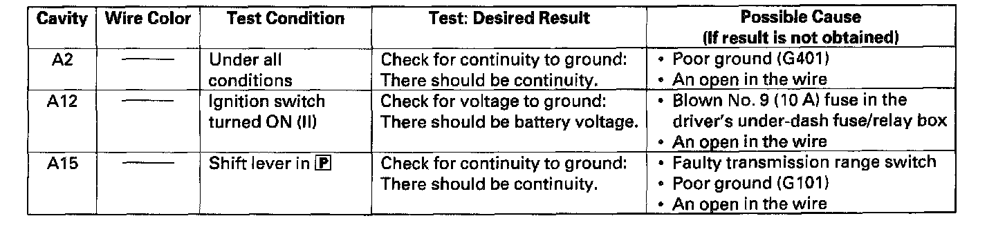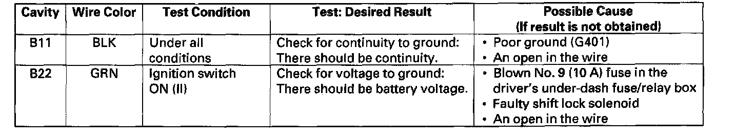 NOTE: If the shift lock solenoid clicks when the ignition switch is turned ON (II) while depressing the brake pedal with the shift lever in the P position, the shift lock system is OK. If the shift lever cannot be shifted from the P position, test the transmission range switch.
