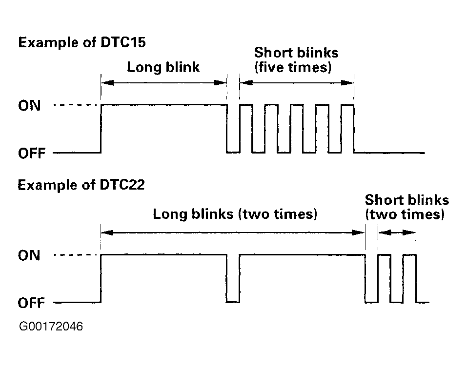 - With ignition switch off, connect Honda Diagnostic System (HDS) to 16-pin Data Link Connector (DLC) located behind driver's side kick panel. Short the SCS circuit to body ground using HDS. Turn ignition switch on. The blinking frequency indicates the DTC. DTC's are indicated by a series of long and short blinks. One long blink equals 10 short blinks. See Fig 1