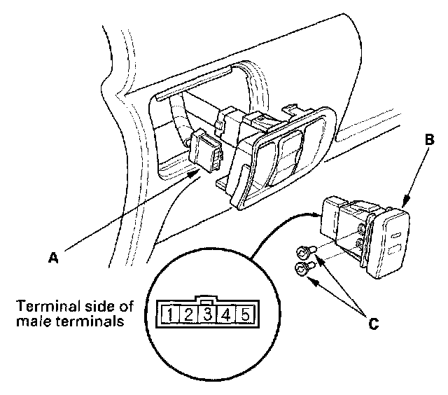 3. Check for continuity between the terminals in each switch position according to the table. If there is no continuity, replace illumination bulbs (C) or the switch.