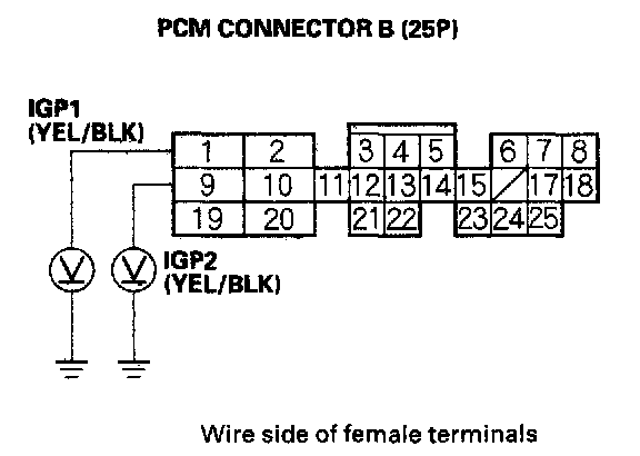 19. Measure voltage between body ground and the PCM connector terminals B1 and B9 individually.