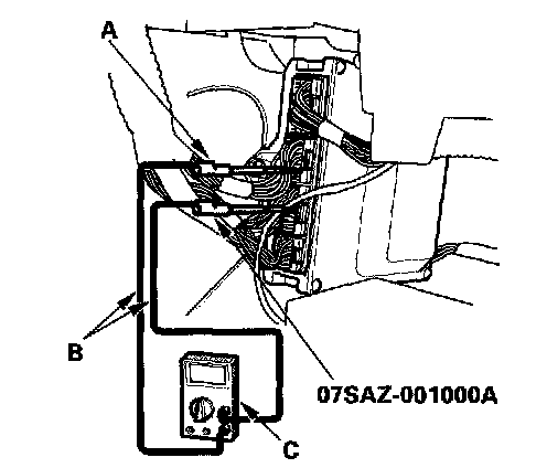 1. Connect the backprobe adapters (A) to the stacking patch cords (B), and connect the cords to a digital multimeter (C).
