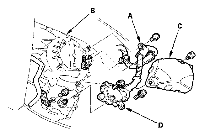 4. Remove the harness clamp (C) from its bracket (D).