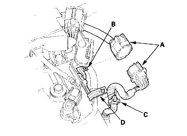 11. Install the harness clamp (C) on its bracket (D).