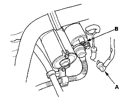 5. Make sure the transmission is in Park or Neutral, then disconnect the BLK/WHT wire (A) from the starter solenoid (B). Connect a jumper wire from the battery positive terminal to the solenoid terminal.