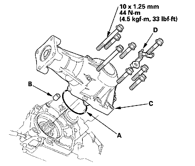 3. Install the dowel pin (B) in the transfer assembly (C), then install the transfer assembly and the harness clamp bracket (D).