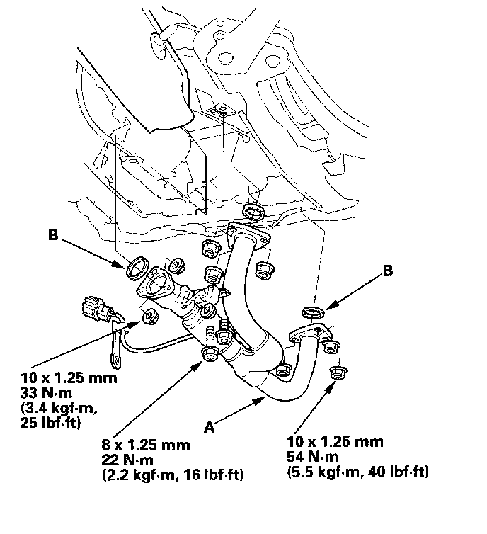 5. Install the exhaust pipe (A) with the new gaskets (B).