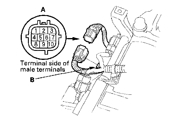 Transmission Range Switch Test1. Remove the transmission range switch harness connector (A) from the connector bracket (B), then disconnect the connector.