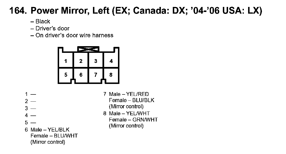 164. Power Mirror, Left (EX; Canada: DX; '04-'06 USA: LX):