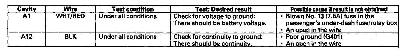 8. With the passenger's multiplex control unit still disconnected, make these input tests at the connectors and the passenger's under-dash fuse/relay box sockets.