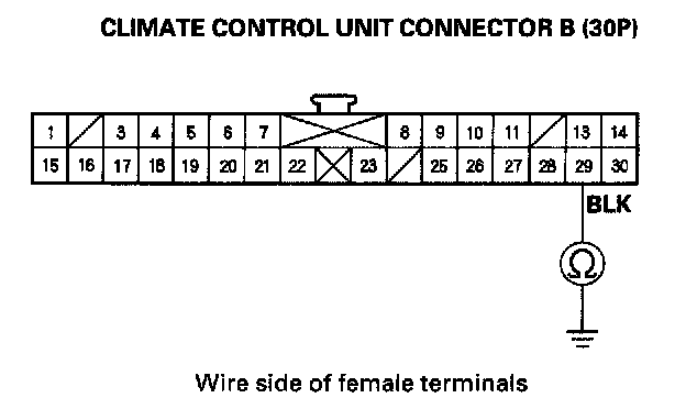 6. Check for continuity between the No. 29 terminal of climate control unit connector B (30P) and body ground.