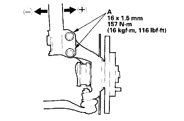 2. Loosen the flange nuts (A), and adjust the camber by moving the bottom of the damper within the range of the damper pinch bolt free play. Tighten the flange nuts to the specified torque.