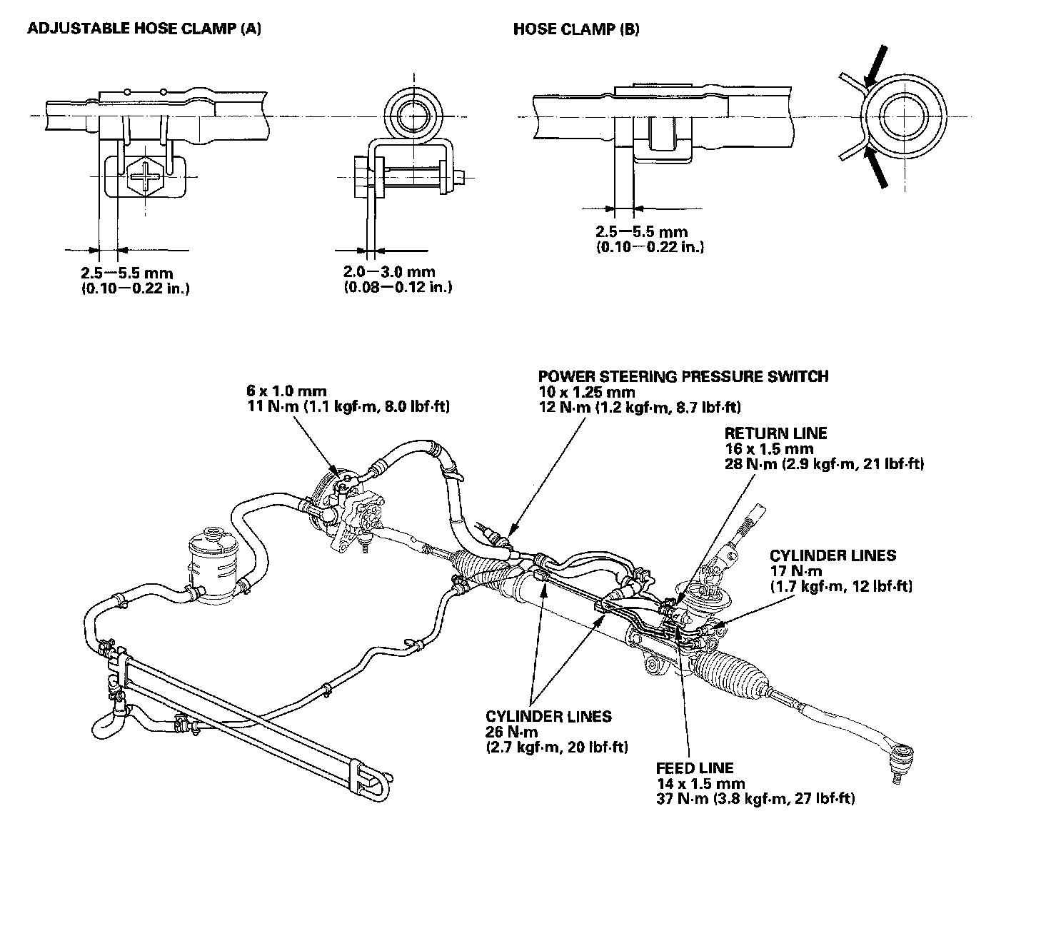 - Connect each hose to the corresponding line securely until it contacts the stop on the line. Install the clamp or adjustable clamp at the specified distance from the hose end as shown.