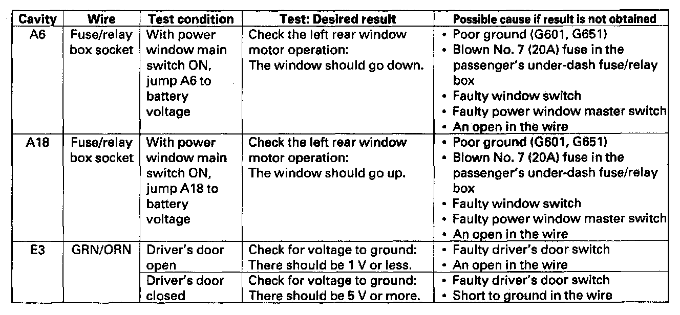 NOTE: For the terminals A4, A5, A10, A11, and A14, refer to the power window control unit input test.