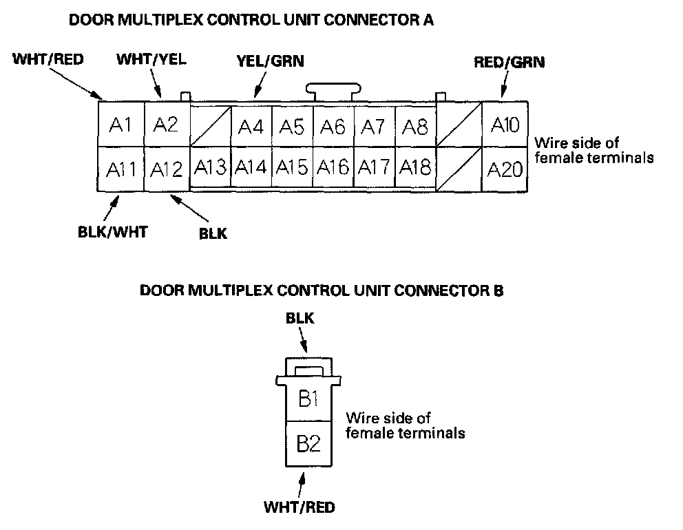 12. With the door multiplex control unit still disconnected, make these input tests at the connectors.