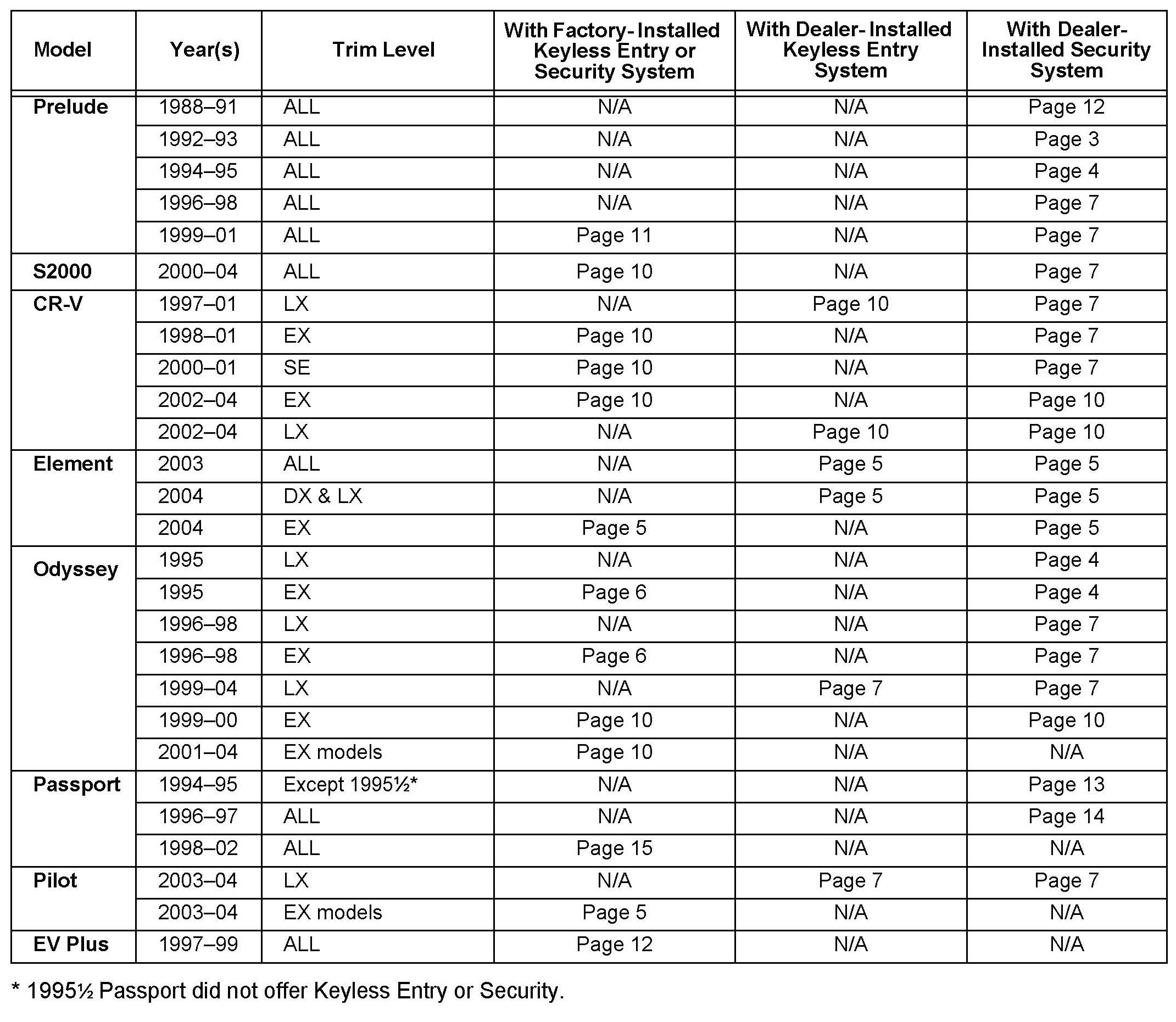 This service bulletin gives you information about keyless remote transmitters for most Honda vehicles. Each procedure describes transmitter programming (if applicable), transmitter ordering, and transmitter batteries. A remote transmitter quick reference guide starts on page 16.