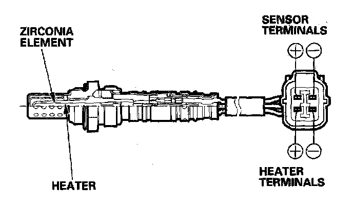 The heated oxygen sensors detect the oxygen content in the exhaust gas, then sends a signal to the ECM which varies the duration of injection accordingly. To stabilize its output, the sensors have an internal heater. The primary sensor is installed in the exhaust pipe. The secondary sensor is installed in the TWC.